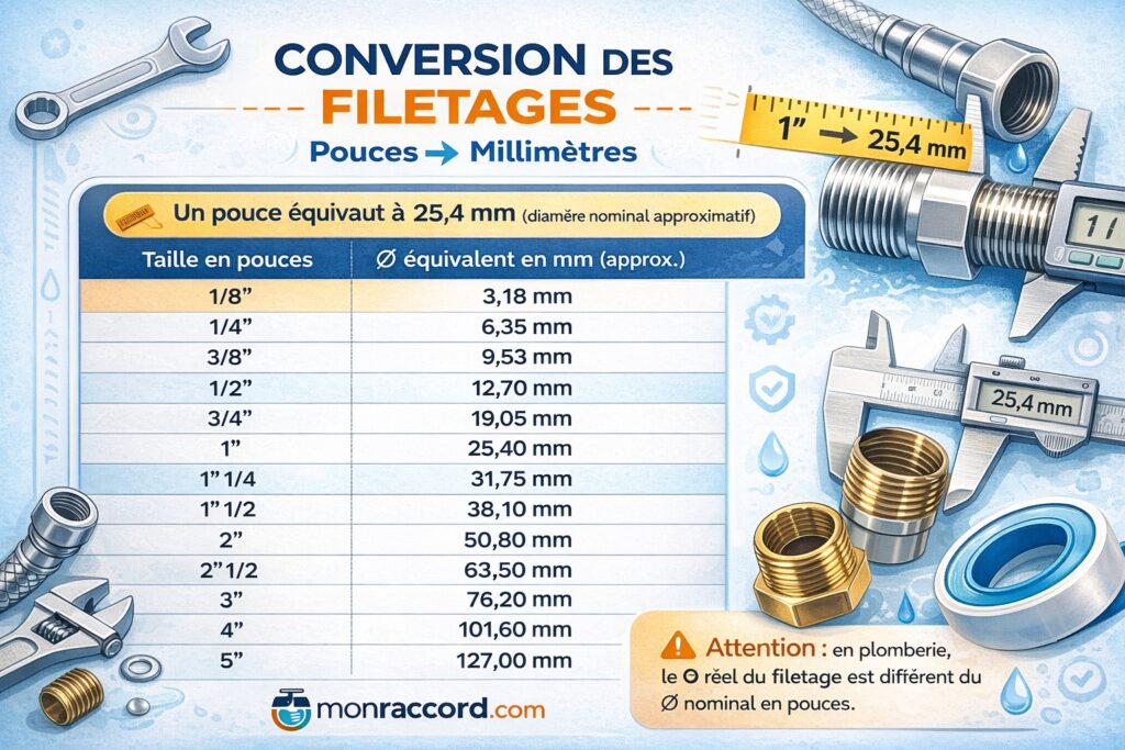 Un pouce équivaut exactement à 25,4 mm. Cette unité est utilisée dans le standard BSP (British Standard Pipe), qui régit la majorité des filetages gaz en Europe.